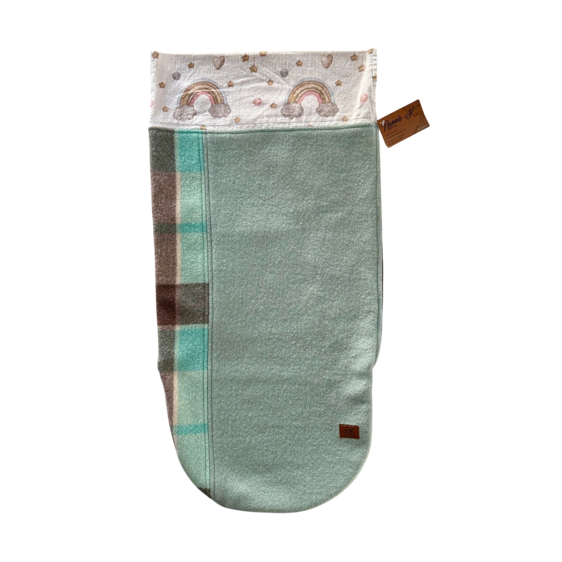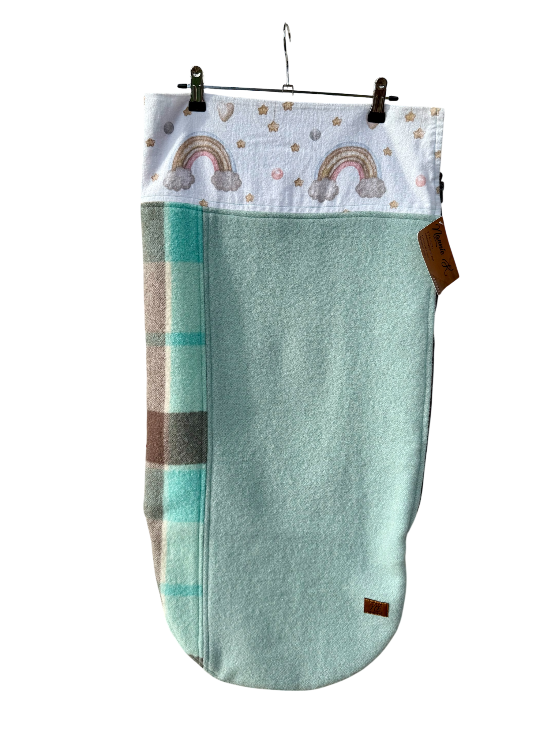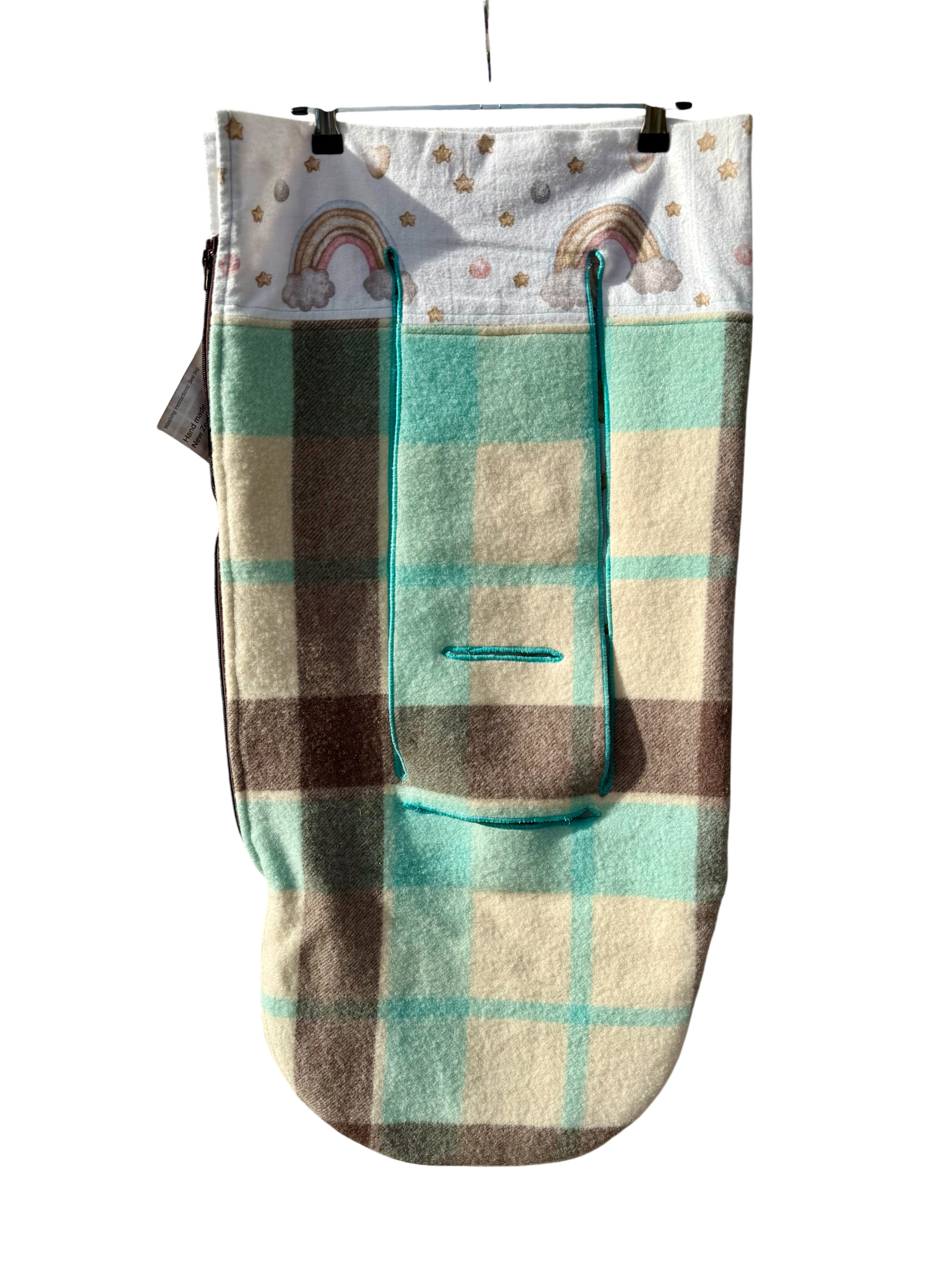 Made from upcycled New Zealand wool blankets and lined with 100% cotton. Perfect for chilly mornings and cooler days, this bag allows you to safely strap in your baby with just the right amount of warmth.